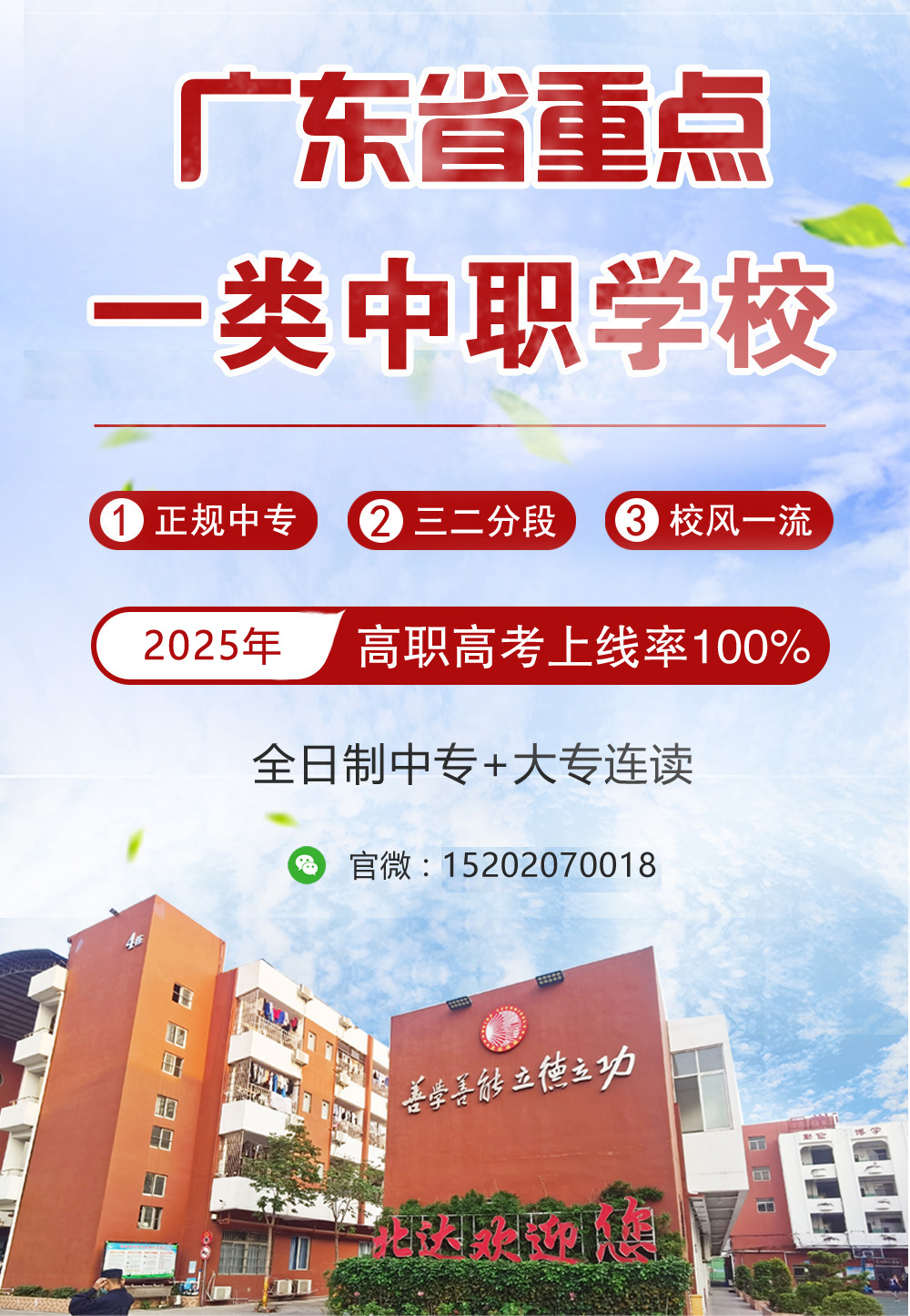 广州市北达技工学校是一所全日制、省重点中职学校,是以、计算机IT技术、眼视光技术等专业为核心;以“高职高考班、3+2直升大专班” 为竞争力的中专技校。位于广州市南沙中心区,倚山临海,在校生3000多人,是广州校风严谨,管理严格的中职学校。